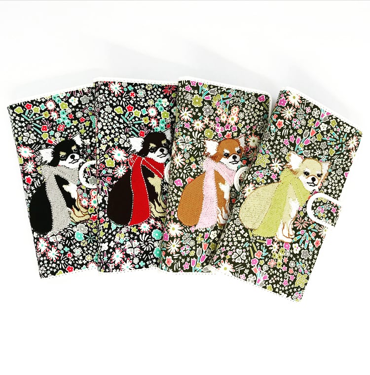 リバティ・ファブリック「タナローン」の心地よいの肌触りのポーチ、手帳スマホケースL、スマホポシェットのオーダーを承ります。刺繍を施した上品で個性豊かなデザインです。