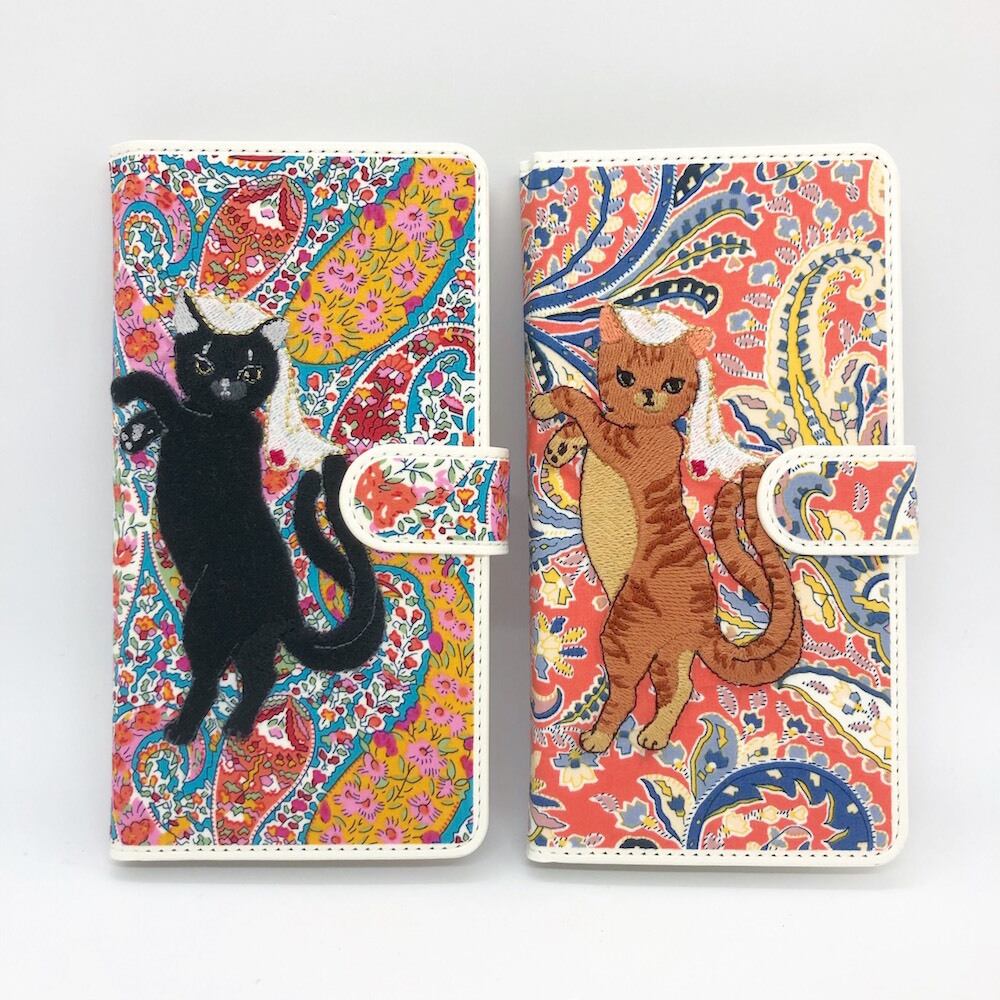 リバティ・ファブリック「タナローン」の心地よいの肌触りのポーチ、手帳スマホケースL、スマホポシェットのオーダーを承ります。刺繍を施した上品で個性豊かなデザインです。