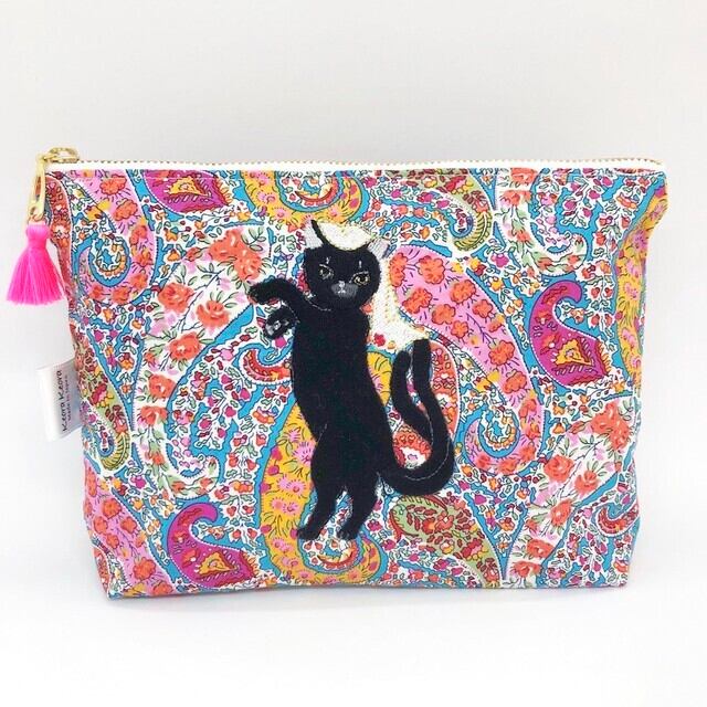 リバティプリントを使用したミニバッグ。ファスナーで開閉。ベースの生地は丈夫な黒の帆布、裏地は綿を使用しています。