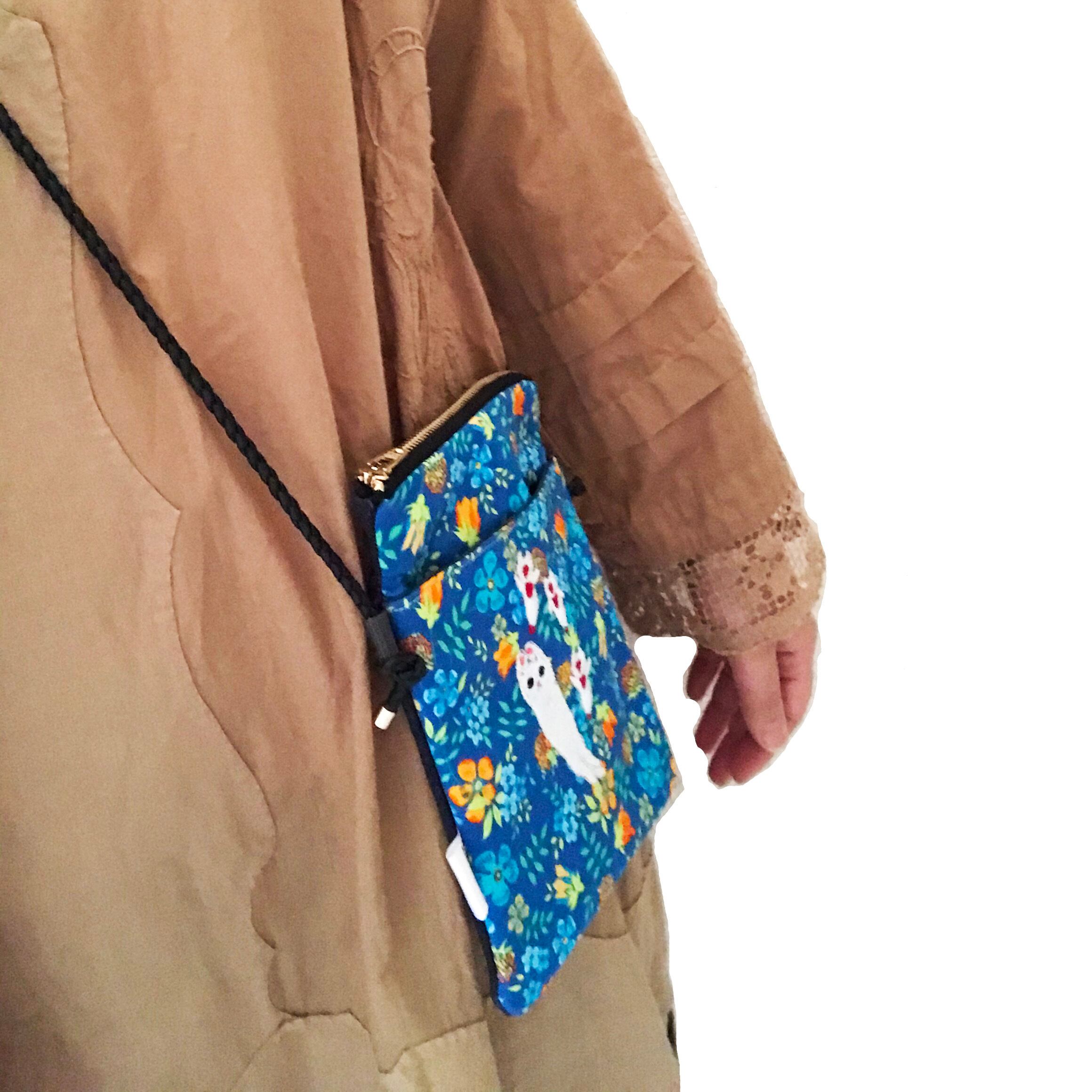 リバティ・ファブリック「タナローン」の心地よいの肌触りのポーチ、手帳スマホケースL、スマホポシェットのオーダーを承ります。刺繍を施した上品で個性豊かなデザインです。