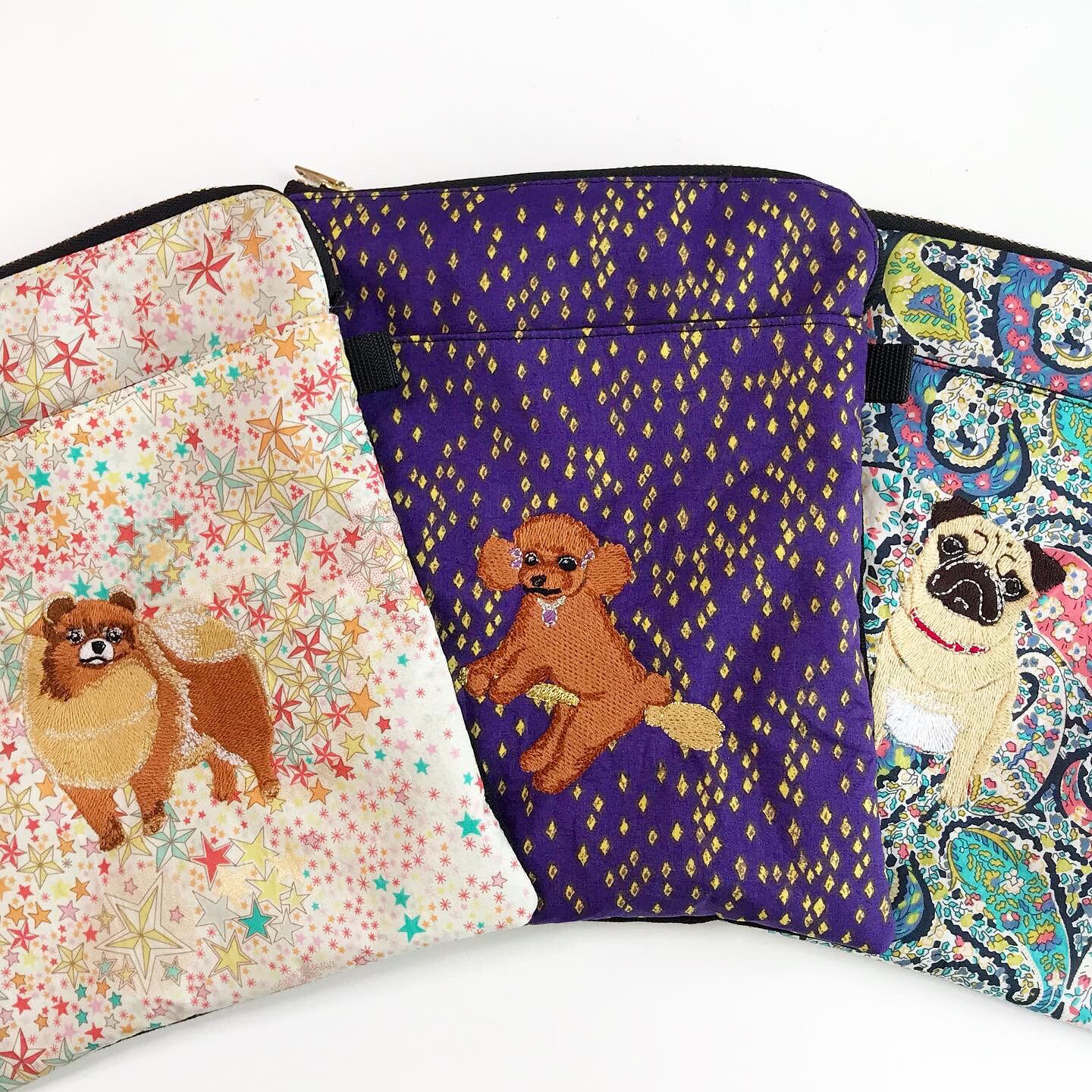 リバティ・ファブリック「タナローン」の心地よいの肌触りのポーチ、手帳スマホケースL、スマホポシェットのオーダーを承ります。刺繍を施した上品で個性豊かなデザインです。