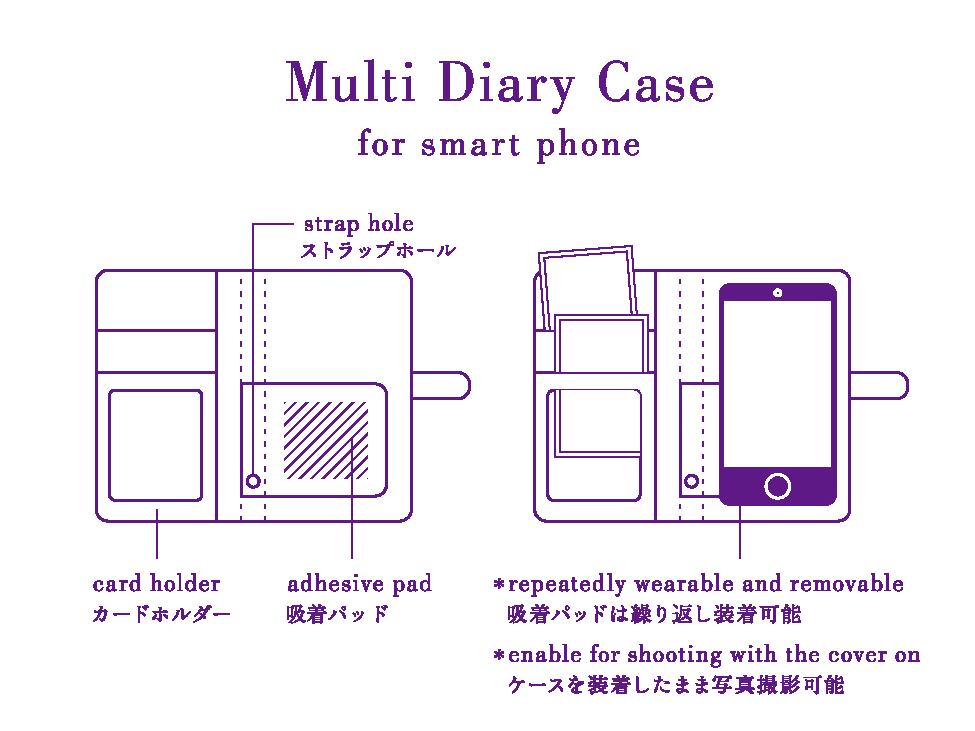 外寸16.2cm×7.9cm以下のスマホに装着可能な手帳型のスマホケースです。内側の吸着パッドに貼り付け、装着します。吸着パッドは繰り返し装着可能。手帳を開く様な形で、装着したままの写真撮影を可能です。(写真4枚目をご参考ください。)ストラップホルダー付。