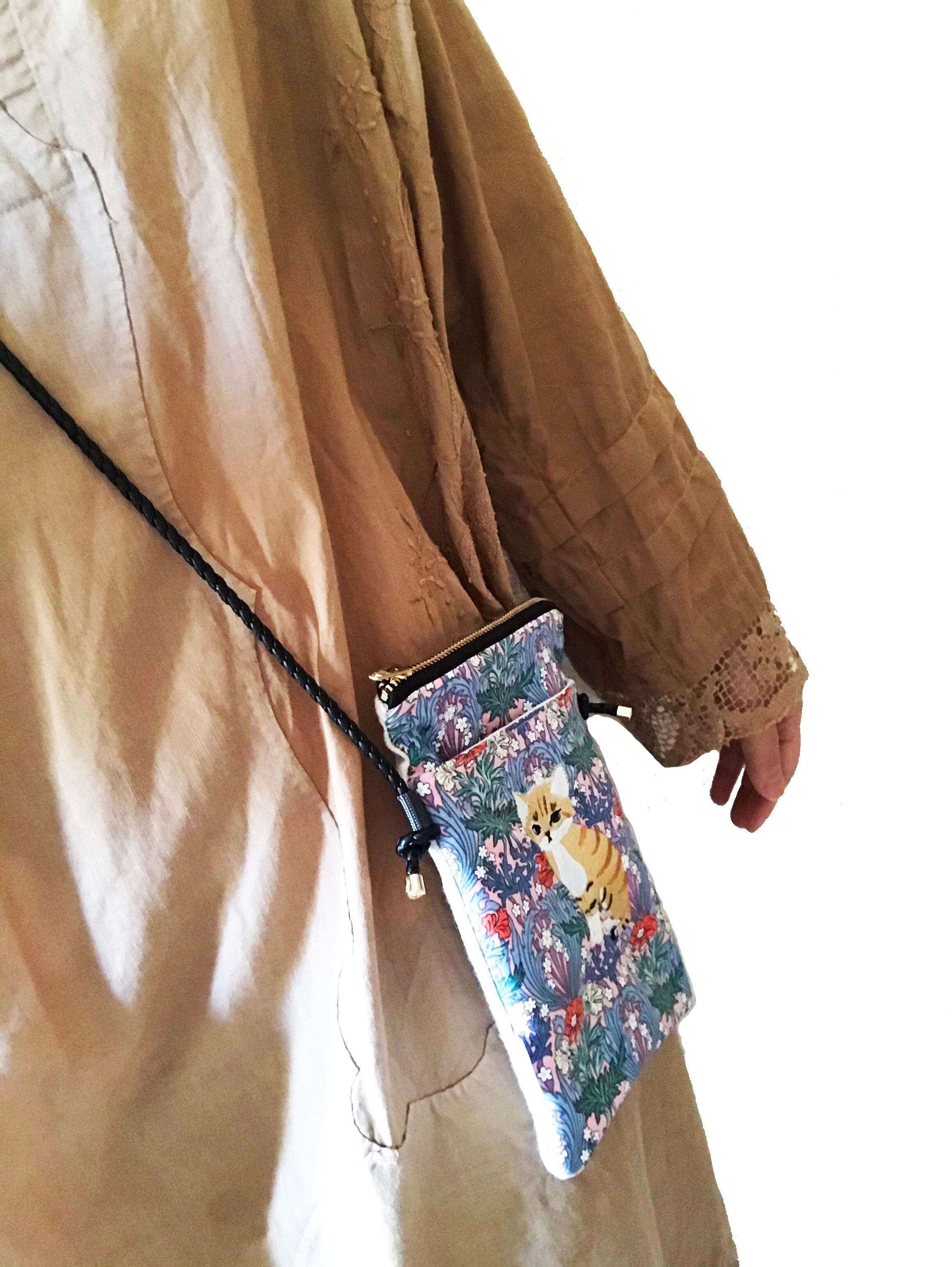 リバティ・ファブリック「タナローン」の心地よいの肌触りのポーチ、手帳スマホケースL、スマホポシェットのオーダーを承ります。刺繍を施した上品で個性豊かなデザインです。