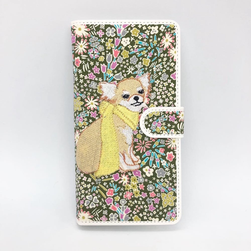 リバティ・ファブリック「タナローン」の心地よいの肌触りのポーチ、手帳スマホケースL、スマホポシェットのオーダーを承ります。刺繍を施した上品で個性豊かなデザインです。