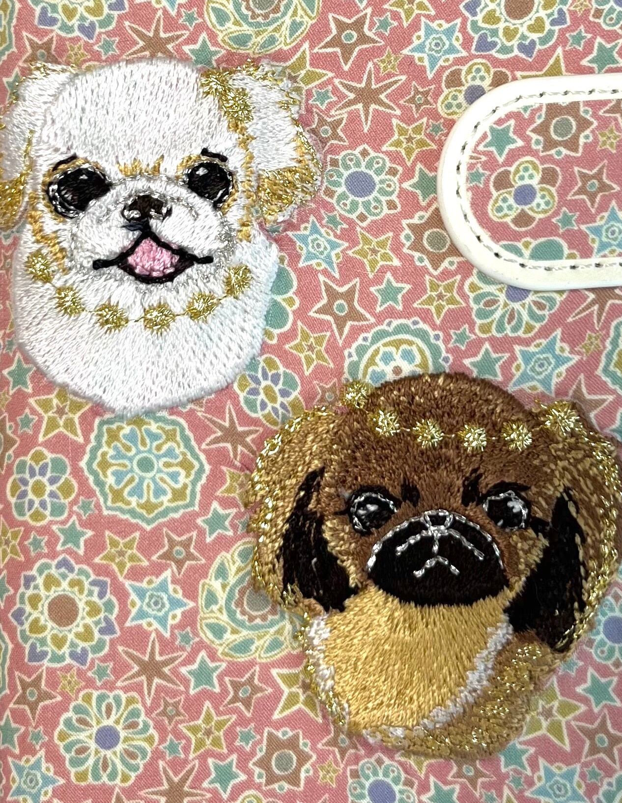 リバティ・ファブリック「タナローン」の心地よいの肌触りのポーチ、手帳スマホケースL、スマホポシェットのオーダーを承ります。刺繍を施した上品で個性豊かなデザインです。