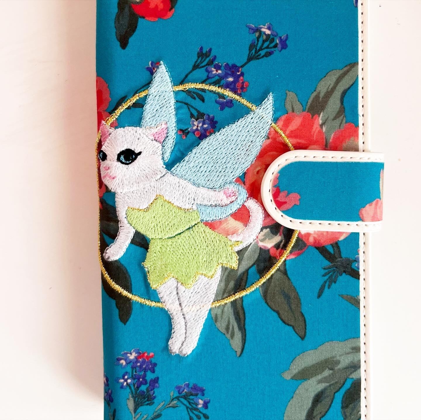 リバティ・ファブリック「タナローン」の心地よいの肌触りのポーチ、手帳スマホケースL、スマホポシェットのオーダーを承ります。刺繍を施した上品で個性豊かなデザインです。