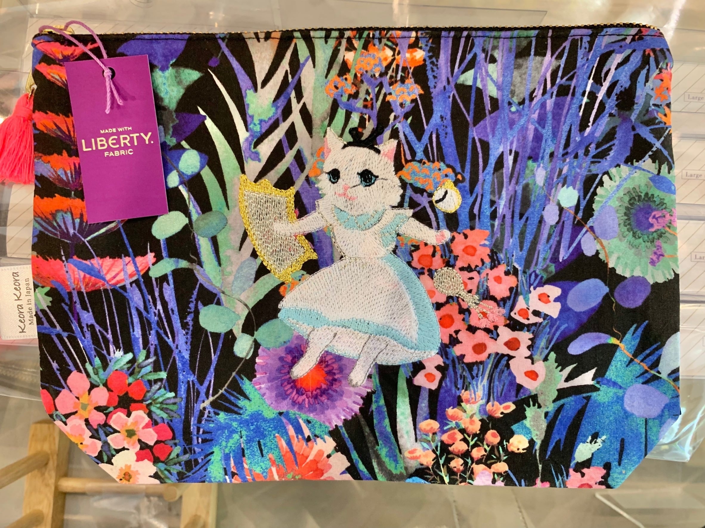 リバティプリントを使用したミニバッグ。ファスナーで開閉。ベースの生地は丈夫な黒の帆布、裏地は綿を使用しています。